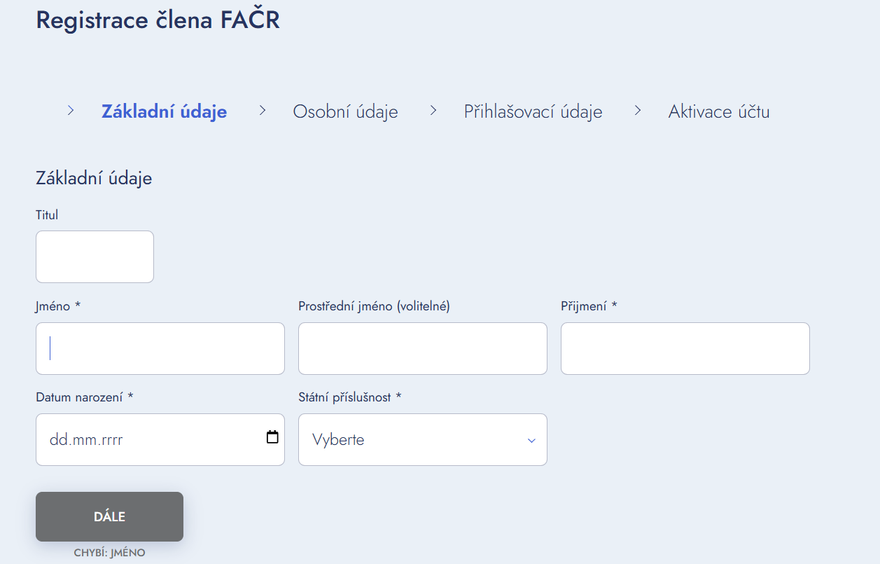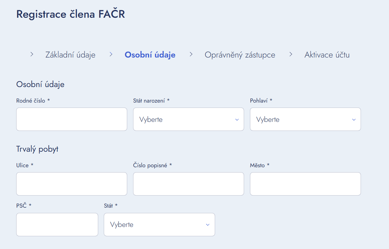 - Upozorňujeme, že podle stanov FAČR je vyplnění elektronické žádosti (přihlášky) člena FAČR jinou osobou nebo případně klubem disciplinárním proviněním, za které může být vyplňující osoba, případně klub orgány FAČR potrestán.
