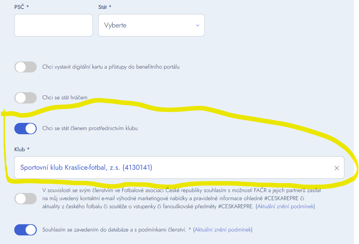 Po posunu dolů zadejte "chci se stát členem prostřednictvím klubu" a najděte náš klub (stačí zadat Kraslice)